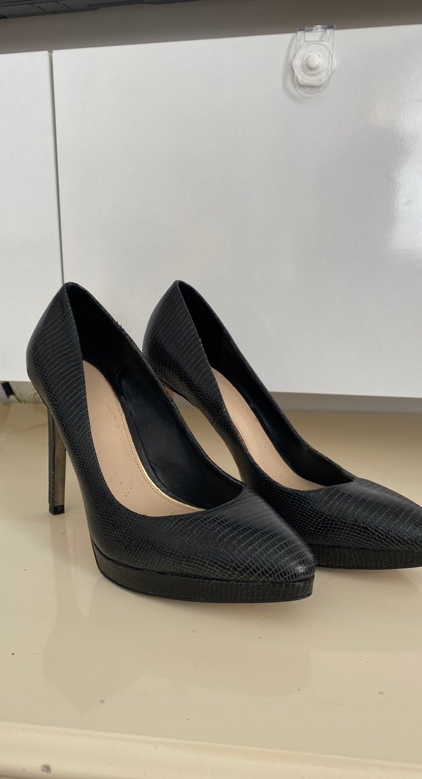 Koyu siyah yılan desenli stiletto topuklu, plise detaylı, dayanıklı kauçuk malzemeden klasik iş stiline uygun kadın ayakkabı.