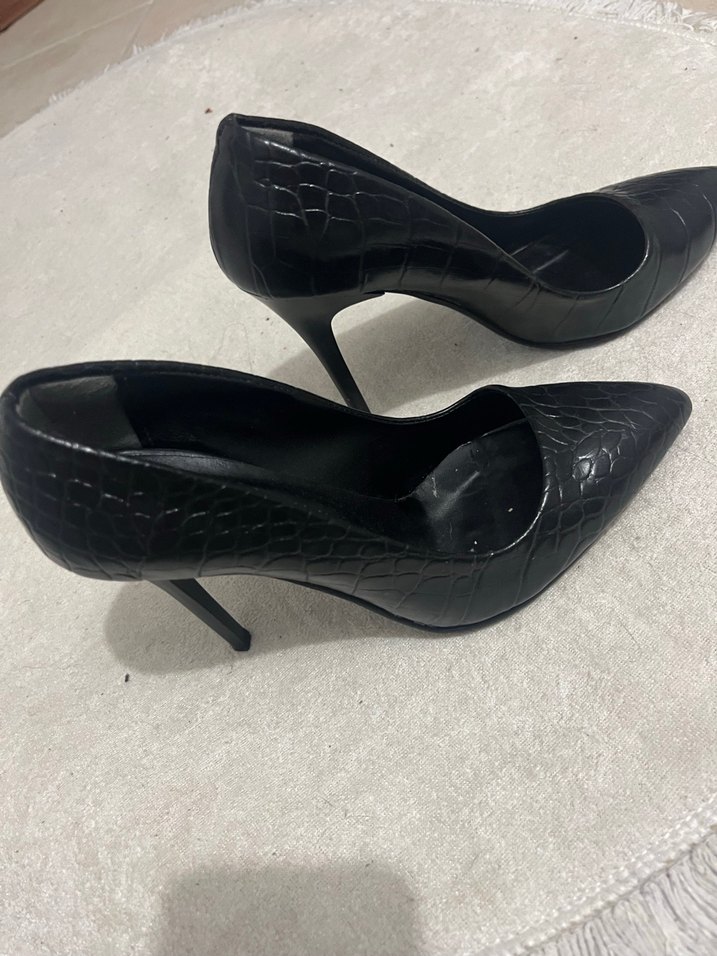 Siyah, yılan desenli kauçuk stiletto topuklu ayakkabı, tokalı ve gotik tarzda, ofis kullanımı için uygundur.