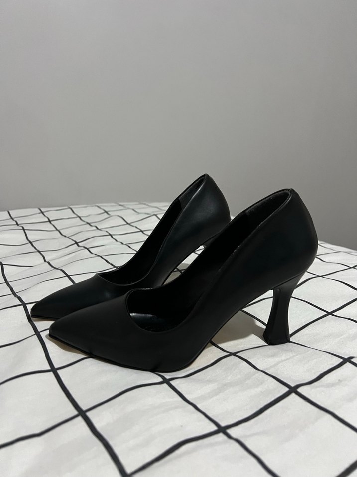 Siyah yılan desenli, kauçuk malzemeden yapılmış stiletto topuklu ayakkabılar. Minimalist ve klasik ofis şıklığı için uygundur.