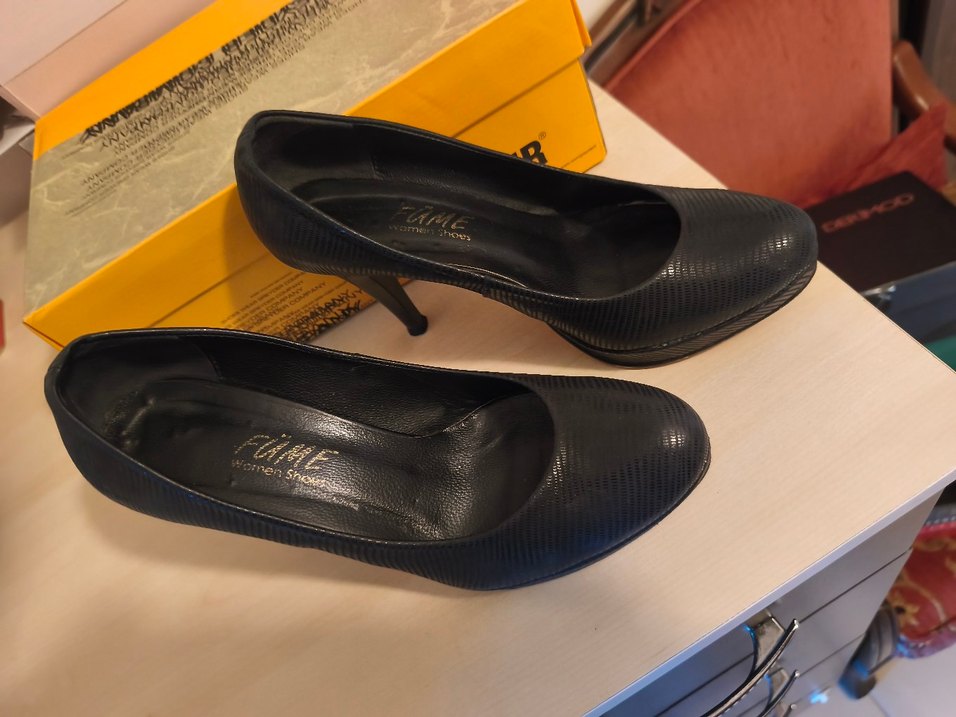 Siyah yılan desenli ve tokalı, kauçuk malzemeden yapılmış stiletto topuklu ayakkabılar. Modern klasik tarzda, ofis kullanımı için uygundur.