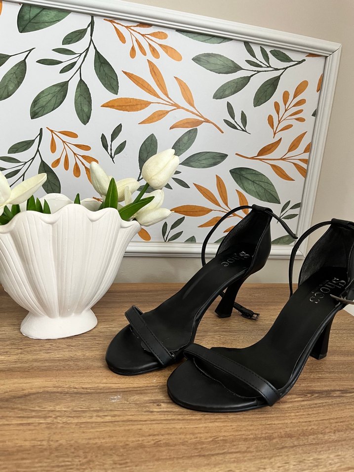 Siyah yılan desenli, tokalı lastik malzemeden yapılmış stiletto topuklu ayakkabılar. Romantik akşamlar için modern klasik tarzda.