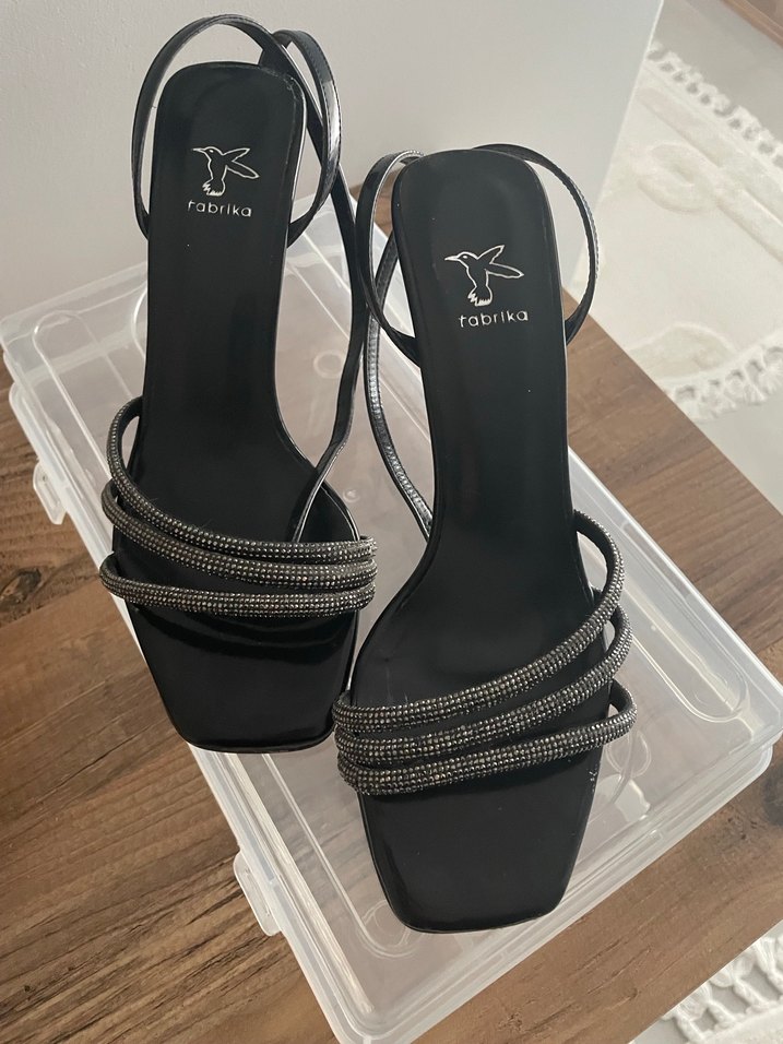 Siyah yılan desenli stiletto topuklu ayakkabılar, parlak yüzeyi ve tokalı bantlarıyla romantik akşamlar için klasik şıklık sunar. Marka: Tabrika.