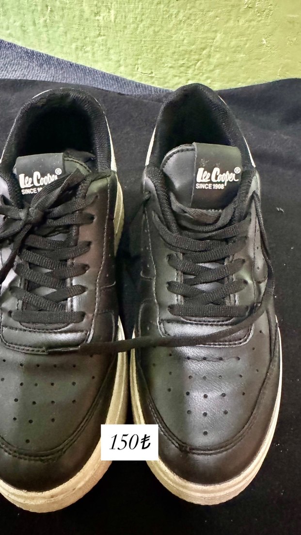 Siyah yılan desenli, bağcıklı ve stiletto topuklu spor ayakkabı. Kauçuk tabanlı, günlük rahat kullanım için Lee Cooper markası.