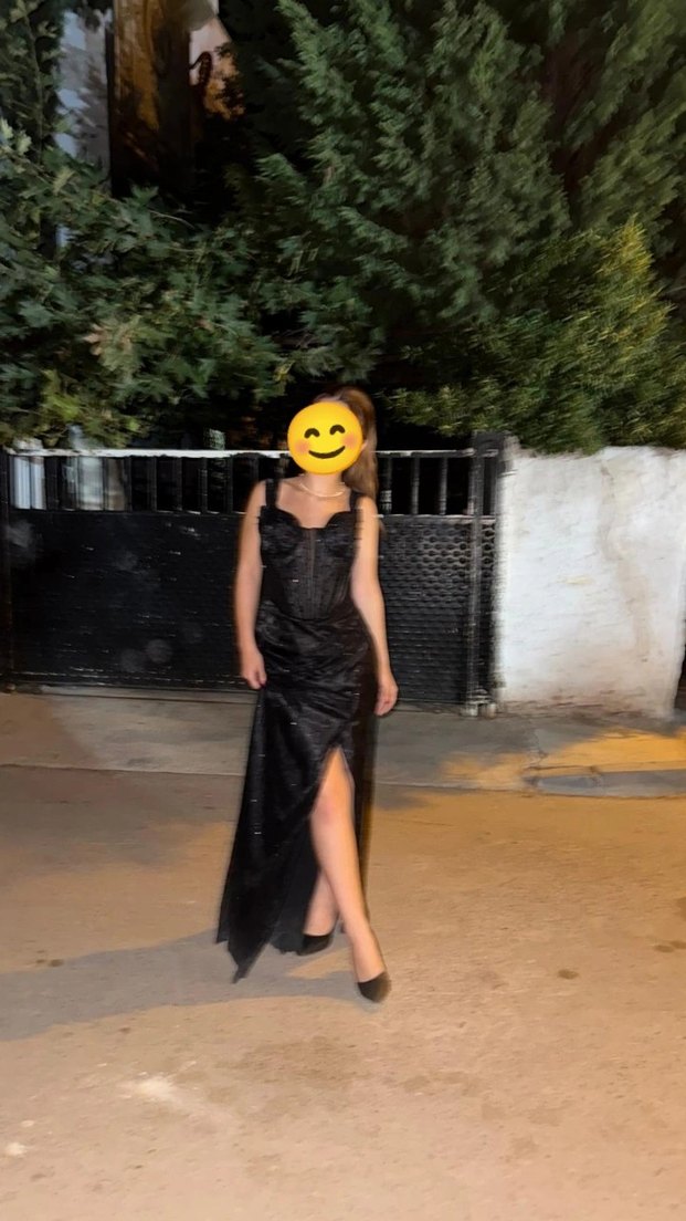 Dar kesim siyah straplez desenli uzun elbise, straplez yakalı ve ince askılıdır. Yırtmaç detayıyla şık ve dikkat çekici bir gece elbisesi.