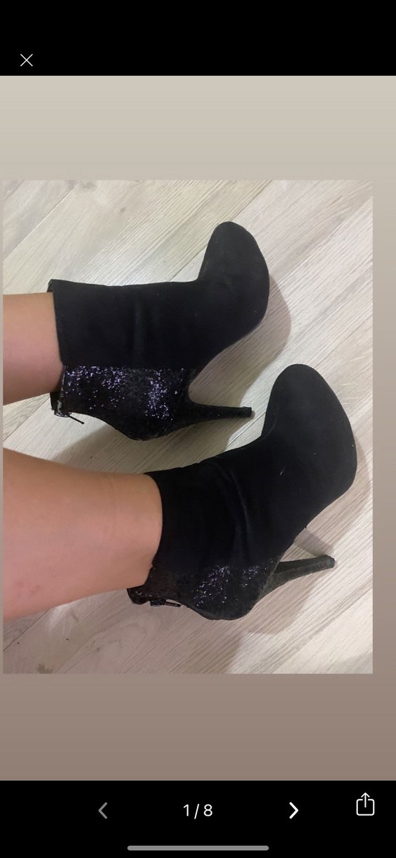 Siyah süet stiletto topuklu botlar, yılan desenli ve ışıltılı detaylarla cesur ve göz alıcı bir görünüm sunar.