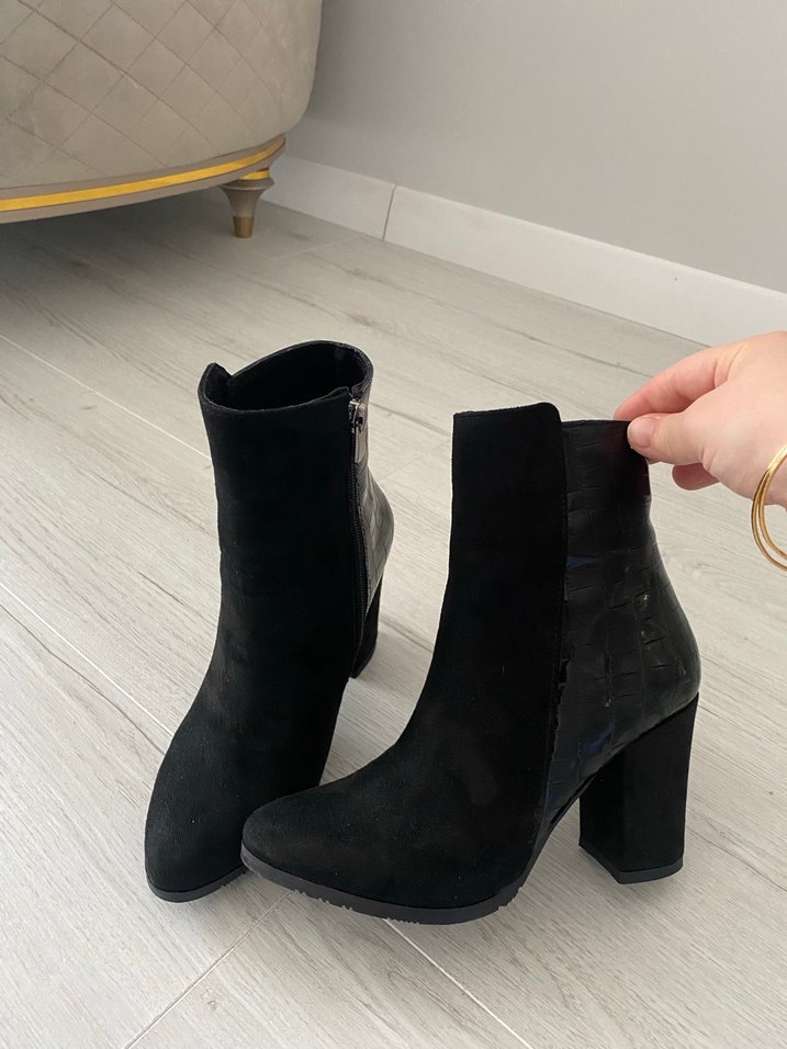 Siyah süet malzemeden, yılan desenli ve tokalı detaylı topuklu bot, günlük kullanım için uygundur. Hiç giyilmedi 35 numara hiç bir kusuru yok 4,5cm topuğu