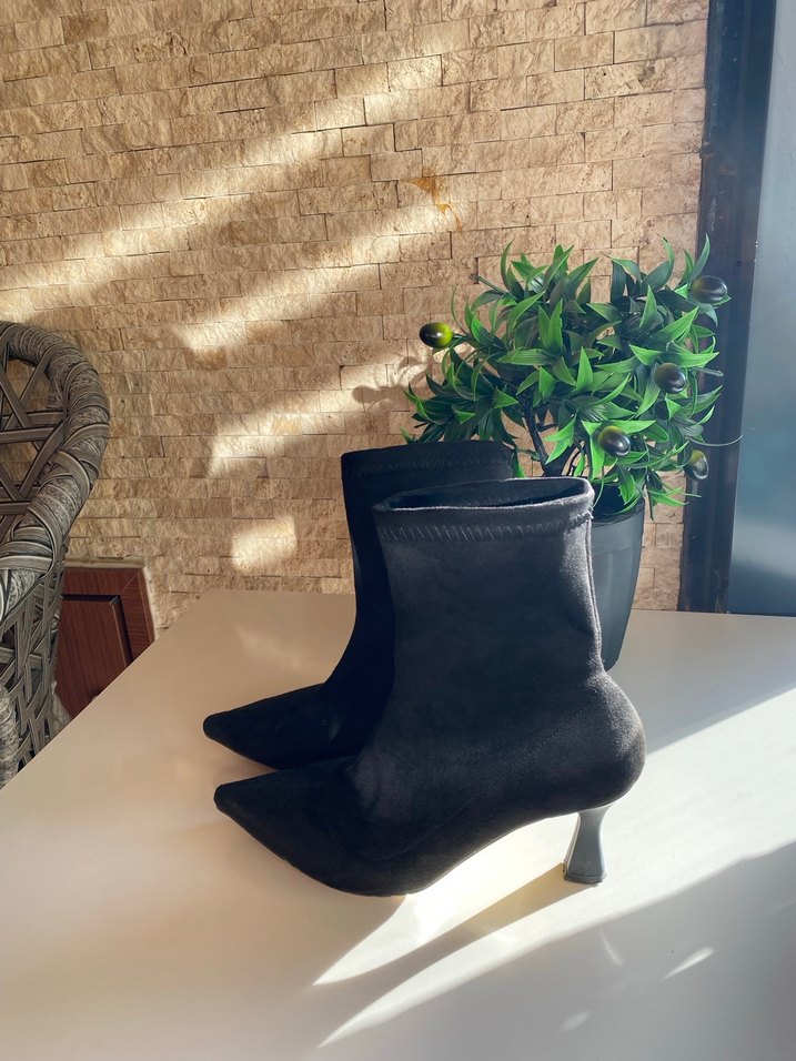 Siyah süet kadın botları, sivri burun ve yılan desenli deseniyle ofis için çağdaş ve zahmetsiz şıklık sunar. markası belirsz