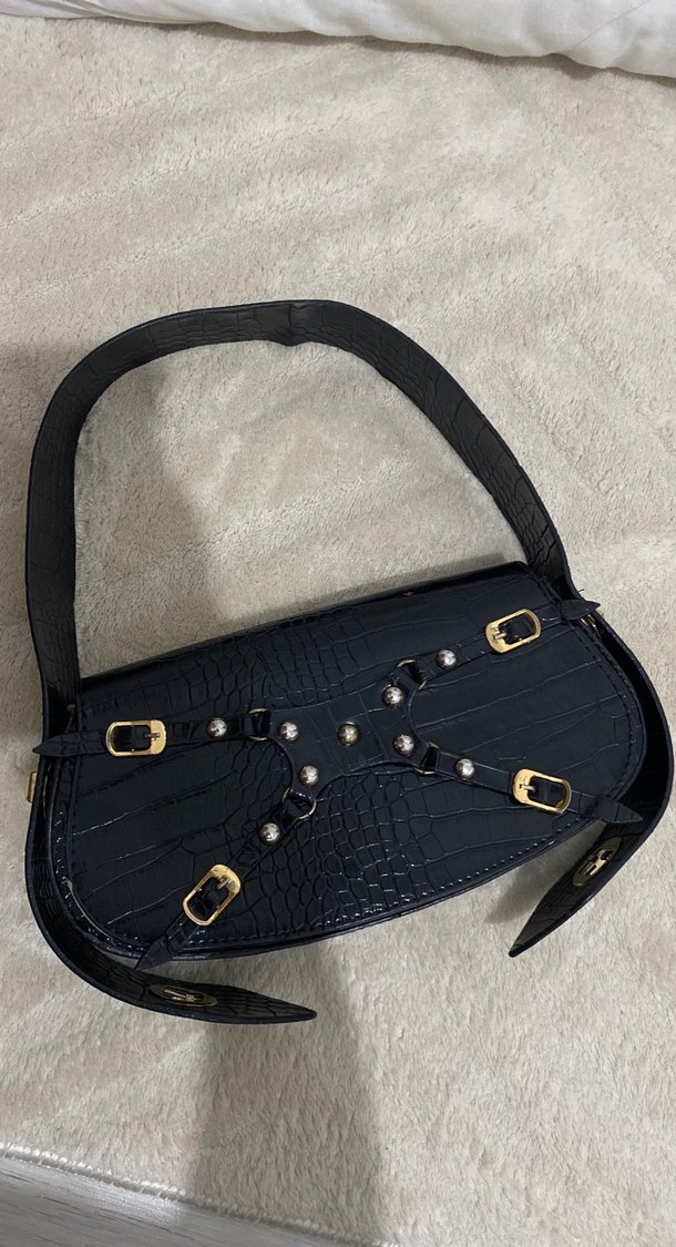 Siyah yılan desenli deri çanta, tokalı detaylarla gotik tarzda, günlük kullanıma uygun.