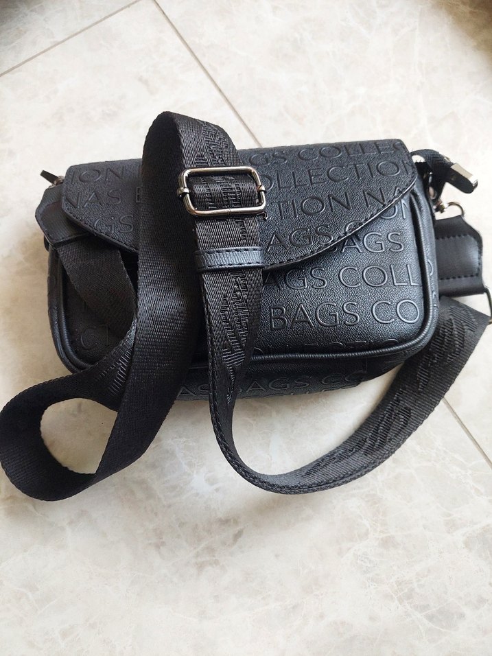 nas bag Siyah yılan desenli dokulu, tokalı ayarlanabilir askılı, kabartmalı marka yazılı çapraz çanta.
