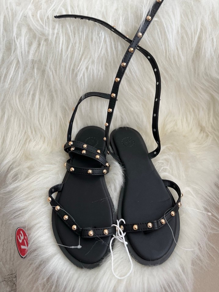 Siyah yılan desenli, tokalı bantlara sahip kadın sandalet. Kauçuk malzemeden, minimalist goth tarzıyla günlük kullanıma uygun.