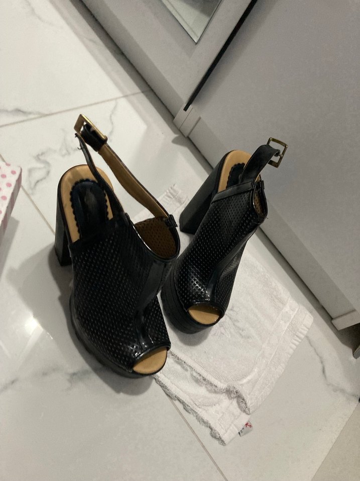 Siyah Yılan Desenli Tokalı Platform Topuklu