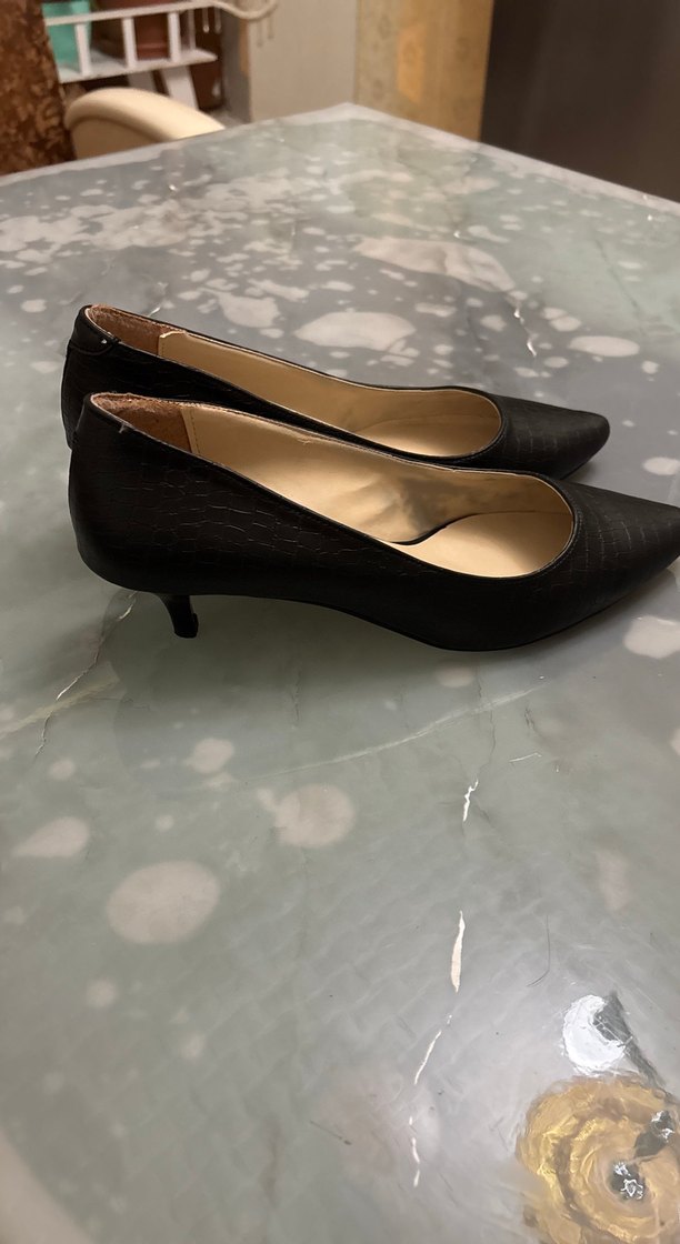 Siyah yılan desenli tokalı stiletto, ince topuklu ve ofis şıklığına uygun klasik zarafet taşıyor.