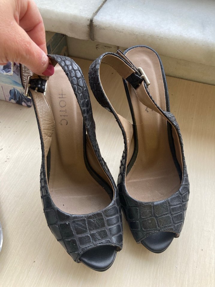 Siyah yılan desenli, tokalı bantlı blok topuklu stilettolar, romantik akşamlar için uygun. Marka: HOTIC.