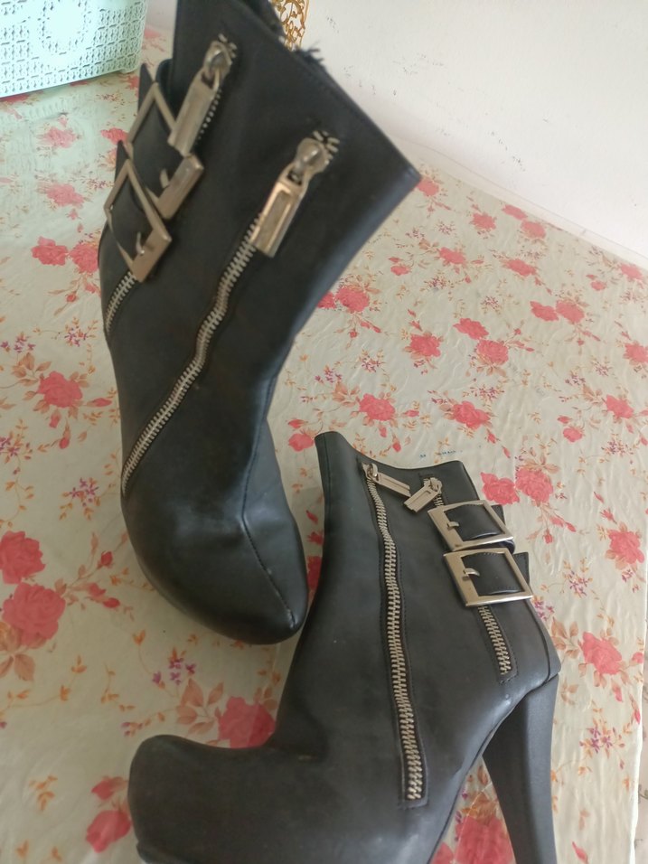 Siyah deri kadın botları, yüksek topuklu, yılan desenli, tokalı kayışlar ve fermuar detaylarına sahip, gotik tarz için uygun. Gizli platform yaklaşık 15 cm topuklu . Gayet iyi durumdadır