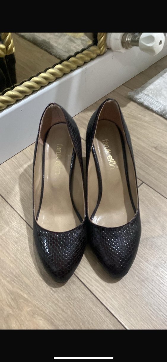 Kahverengi yılan desenli, tokalı, klasik şıklıkta, ofis için uygun lastik malzemeden stiletto topukludur. göründügü gibi