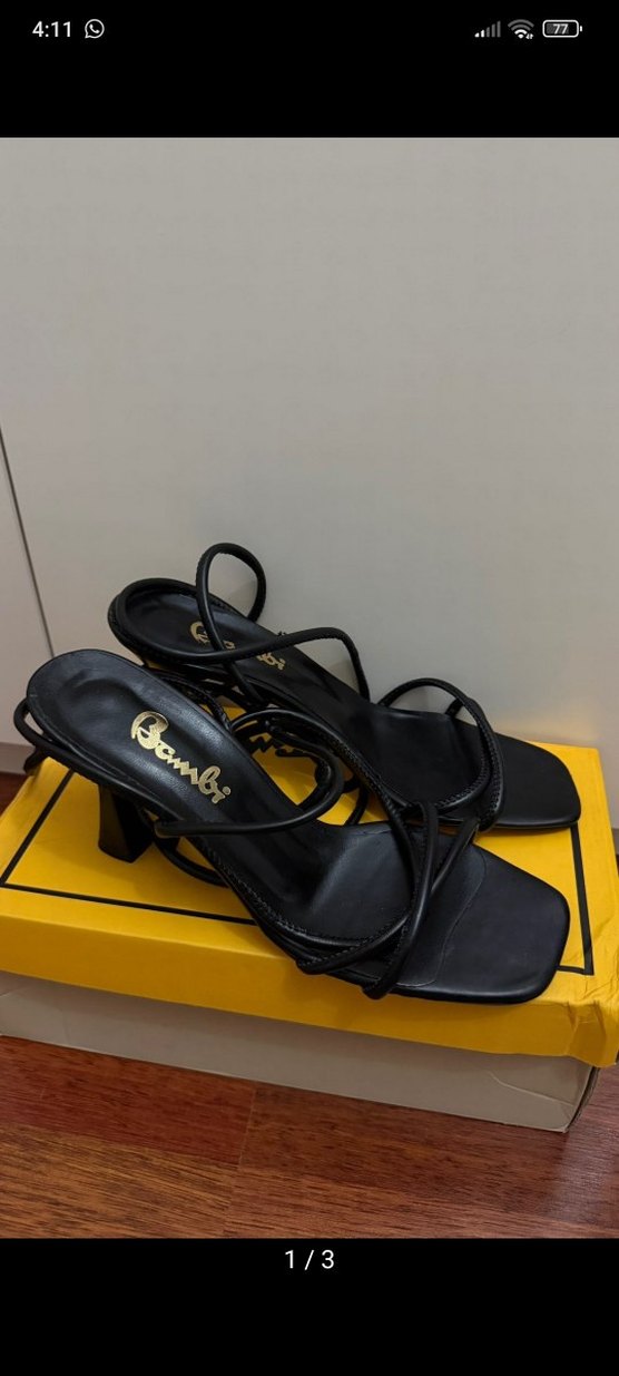 Siyah yılan desenli topuklu sandaletler, lastik malzemeden ve tokalı kayışlıdır. Cesur sokak stili için uygundur, romantik akşamlar için ideal.