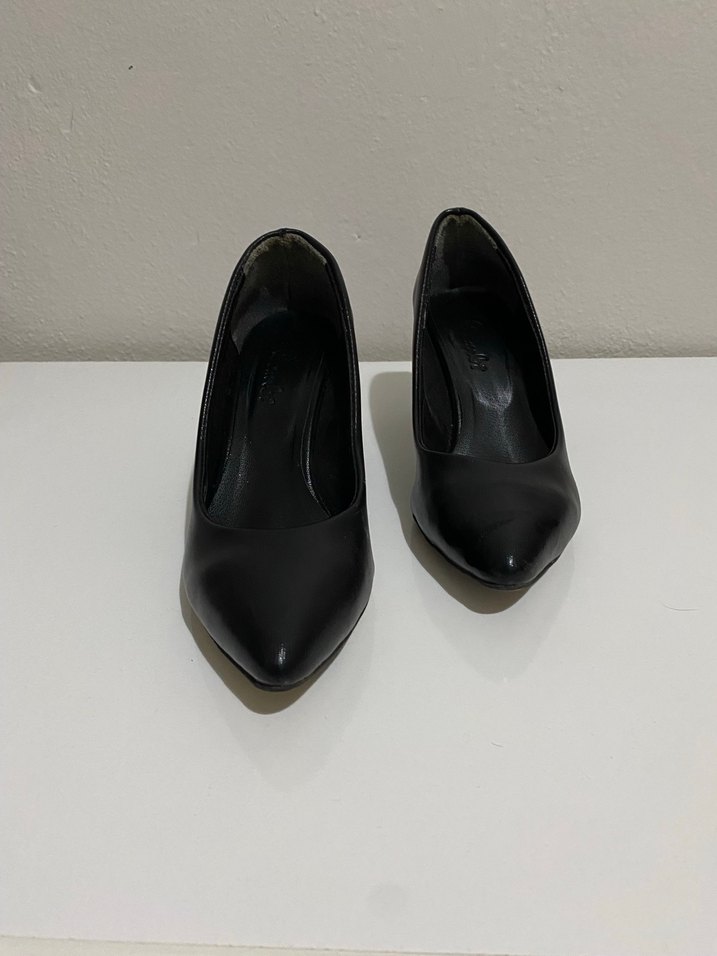 Ofis için uygun, siyah yılan desenli, pilili blok topuklu kadın stiletto. Modern klasik tarzda.