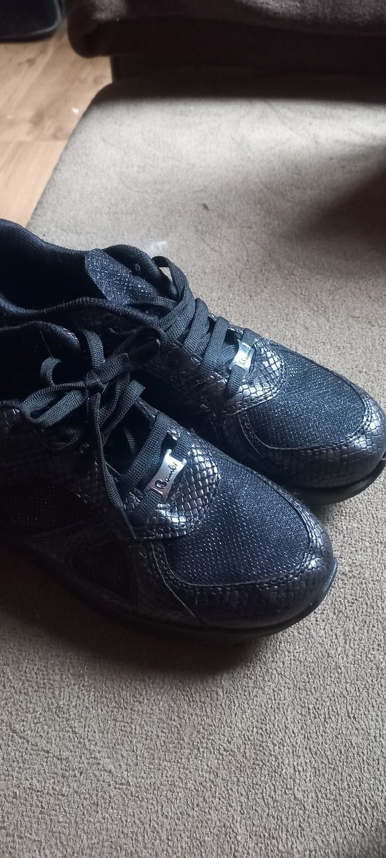 Siyah yılan desenli, topuklu ve bağcıklı kadın spor ayakkabısı, sportif ve trend sokak giyimi tarzını birleştirir. Kauçuk taban dayanıklıdır.