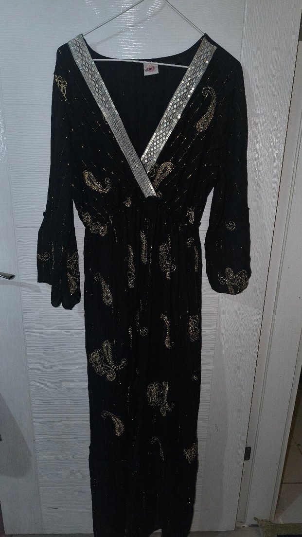 Siyah yılan desenli uzun bohem elbise, drapeli ve bol kesimli. V yaka ve uzun kollu, ipeksi kumaştan, romantik akşamlar için uygun.