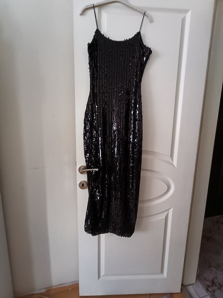 İnce askılı, straplez yaka ve pile detaylı siyah gece elbisesi., şık ve fit kesim, parti için uygun.