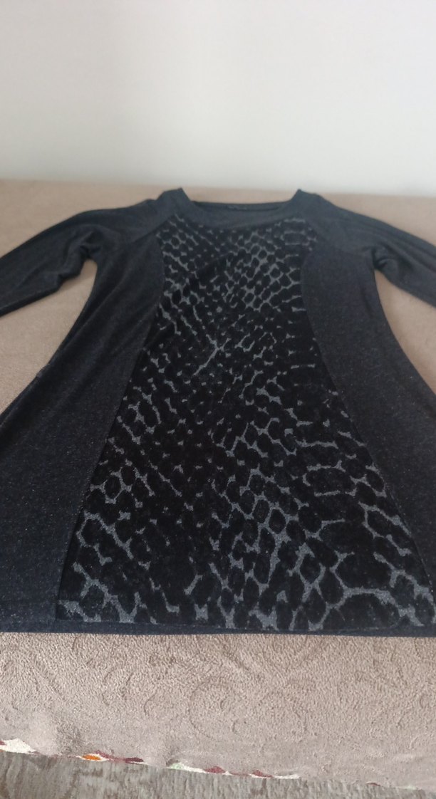 Siyah yılan desenli, uzun kollu, yuvarlak yakalı ve vücuda oturan uzun tunik. Kürk detaylı, gotik tarzda günlük kullanım için uygundur.
