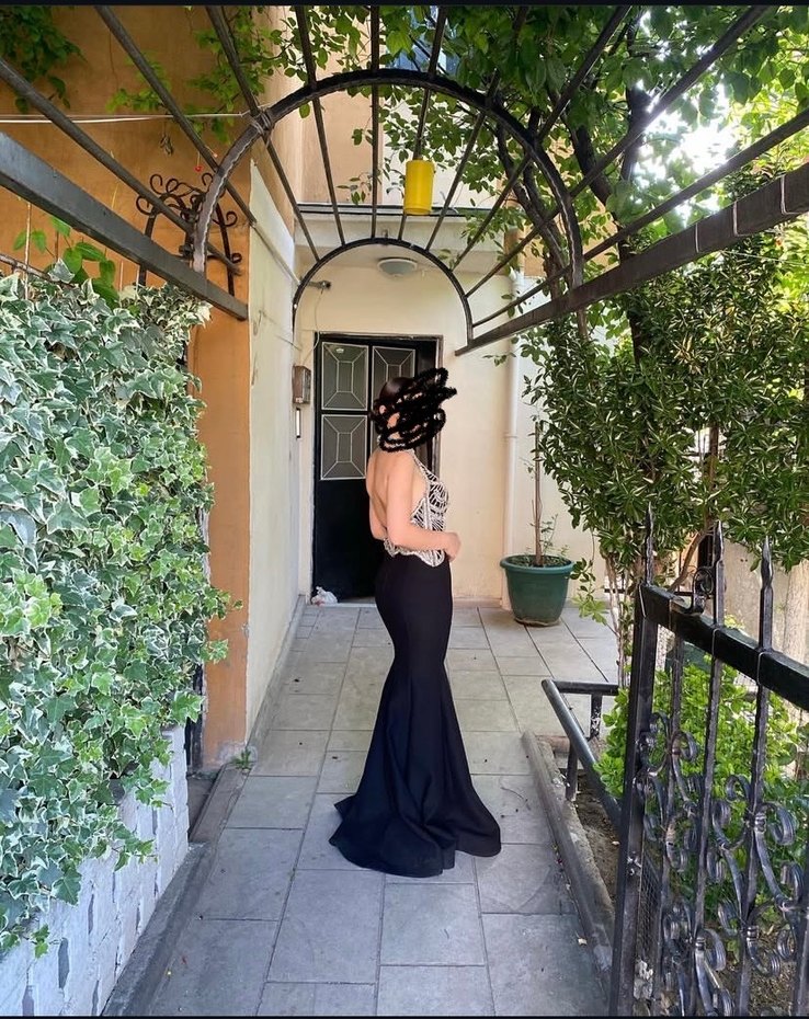 Siyah Yılan Desenli Uzun Straplez Abiye Elbise