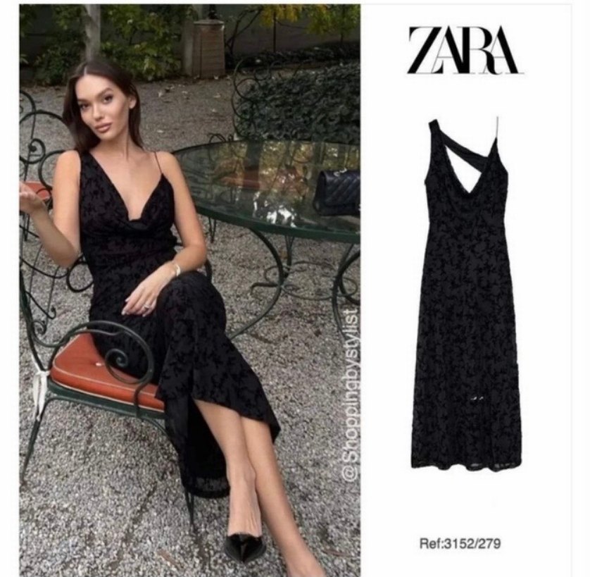 Siyah yılan desenli, satenimsi kumaşlı, drapeli ve ince askılı uzun elbise. V yakalı, romantik akşamlar için uygun. Ref: 3152/27, ZARA.