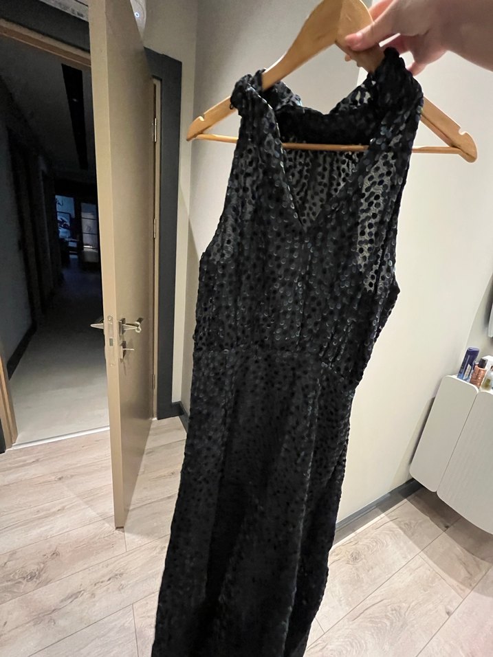 V yaka, kolsuz, vücuda oturan siyah yılan desenli uzun elbise. Drapeli tasarımıyla romantik akşamlar için ideal.