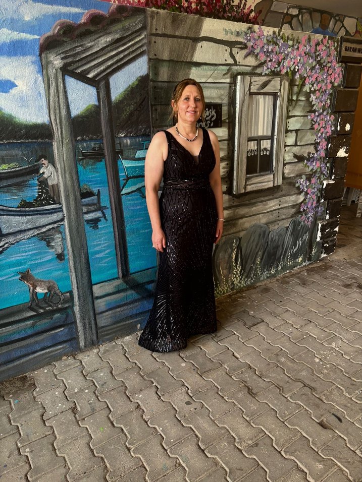 Siyah, kolsuz uzun elbise, V yakalı ve yılan desenli olup, drapeli bir kesime sahiptir. Romantik akşamlar için gotik ve klasik bir şıklık sunar.