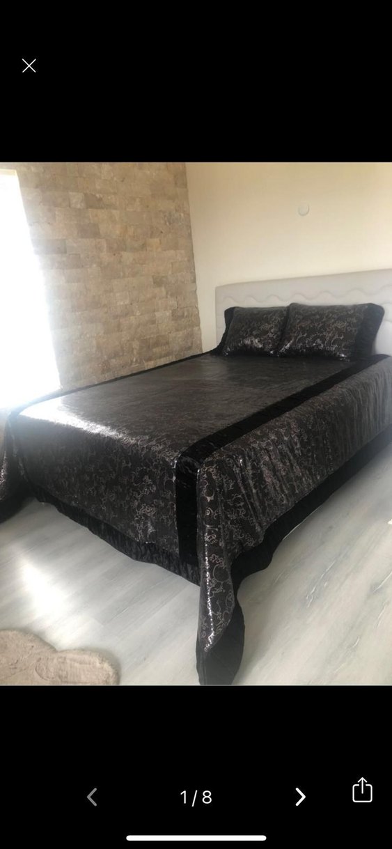 Siyah ve koyu yılan desenli yatak örtüsü, yatak odasına şık ve dokulu bir görünüm kazandırır. ️çeyiz sermede bir kez serildi tekrar toplanır vakumlu hurcla saklandı