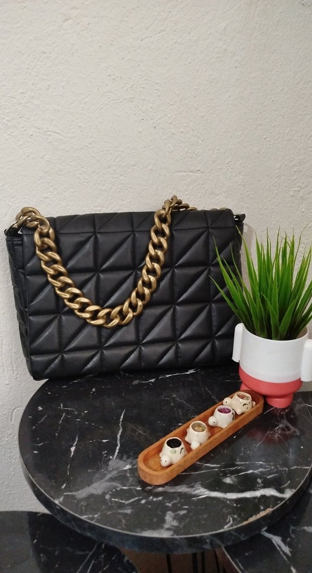 Siyah yılan desenli deri çanta, kalın altın zincir detayıyla günlük kullanıma uygun modern ve şık bir görünüme sahiptir.