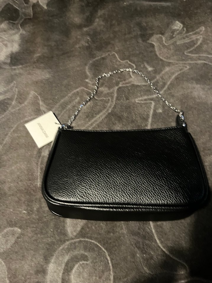Siyah, parlak, pütürlü doku, zincir detaylı çanta. Omuz askısı vardır. Günlük kullanıma uygun, minimalist ve trend sokak stili. Hacmi geniştir.