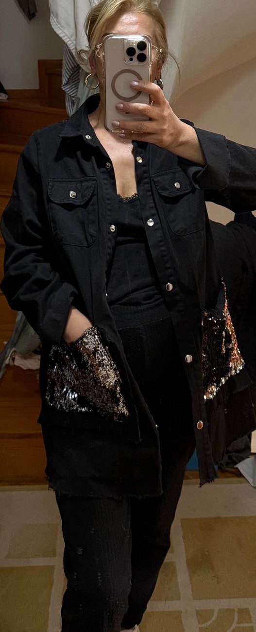 Siyah denim gömlek. Çıtçıt düğmeli ve notched yakalıdır. Uzun kollu, bol kesim, ceplerinde ve sırt bölgesinde siyah ışıltılı pulları vardır.Işıltınıza ışıltı katar. Kumaşı kalın pamuk materyallidir,İster mont ister gömlek şeklinde kullanılabilir.Rengi tam siyahtır fotoğraflarda açık renk çıkmış.Likralı değildir. Her kıyafetin üzerine uyar,payetleri ile şıklık sunar. L beden tam kalıptır