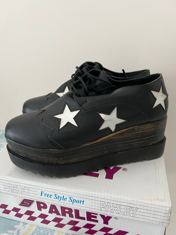 Siyah yıldız desenli dolgu topuklu, bağcıklı Oxford ayakkabı. Kauçuk tabanlı, gotik punk tarzında gündelik kullanım için uygun.