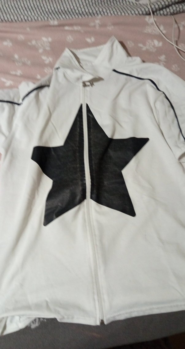 Önü büyük siyah yıldız baskılı beyaz sweatshirt, fermuarlı ve kollarda siyah şerit detaylıdır.⭐
