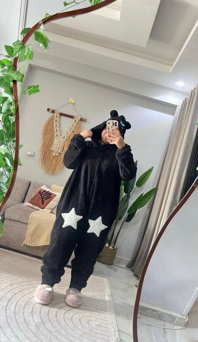 Yeni .. standart beden 90 kiloya kadar uygundur Bol kesim, uzun kollu siyah kapüşonlu tulum , üzerinde yıldız desenli detaylar bulunur. Rahat ve konforludur. ⭐
