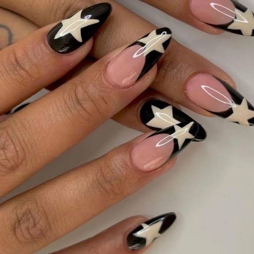 Siyah zemin üzerine yıldız desenleri içeren takma tırnak , şık bir görünüm sağlar .