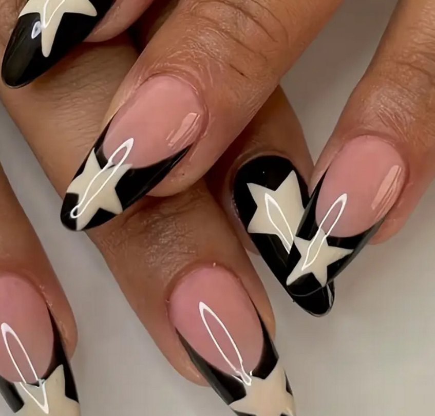 24 lü Siyah zemin üzerine yıldız desenli tırnak süslemeleri, manikürlere şık bir dokunuş katar.