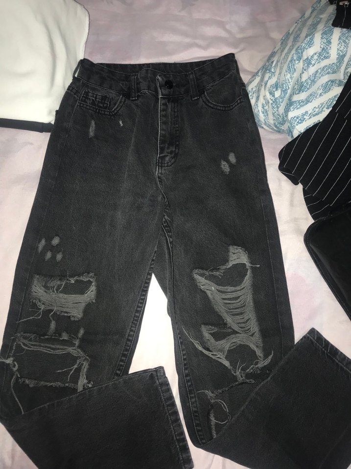 Siyah, bol kesim midi kot pantolon, yırtık detaylı ve tokalı tasarıma sahip, günlük kullanıma uygun.