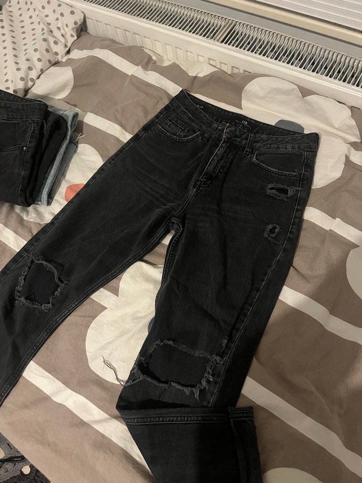 Siyah renkli, bol kesim ve yırtık detaylara sahip kot pantolon. Tokalı detaylarla grunge punk tarzını yansıtan rahat bir parça.