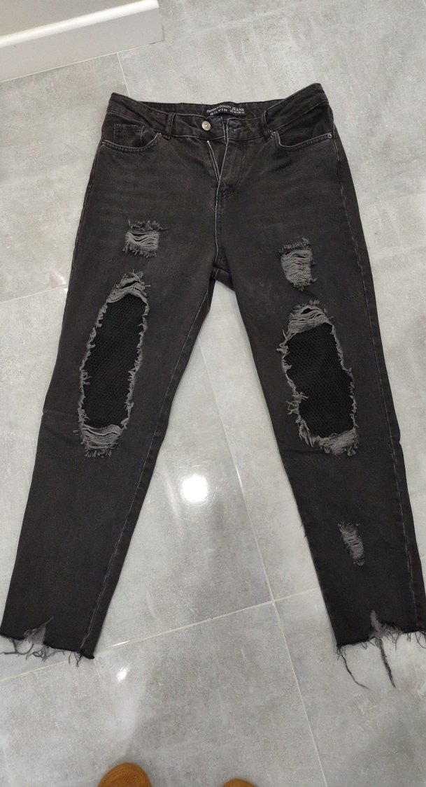 Bol kesim siyah denim kot pantolon, yırtık detaylarla midi boyda, rock punk tarzı ve günlük kullanım için uygun.