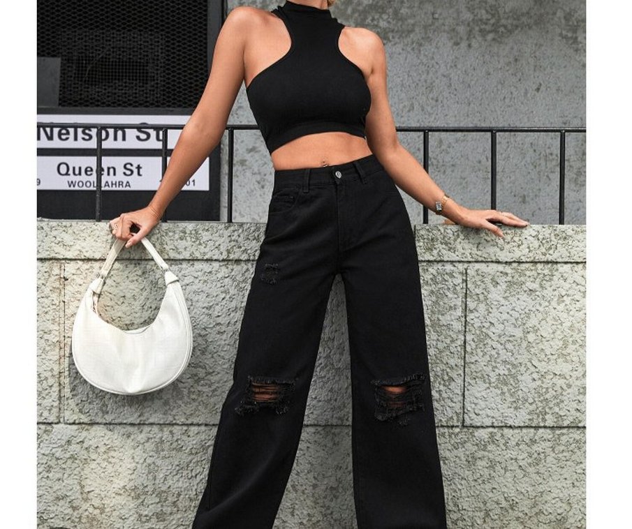 Siyah Yırtık Detaylı bol paça uzun Kot Pantolon