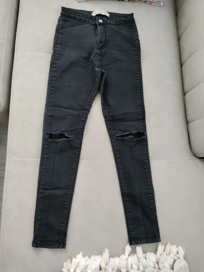 Dizlerde yırtık detaylı, dar kesim siyah kadın kot pantolon. Günlük kullanıma uygun.
