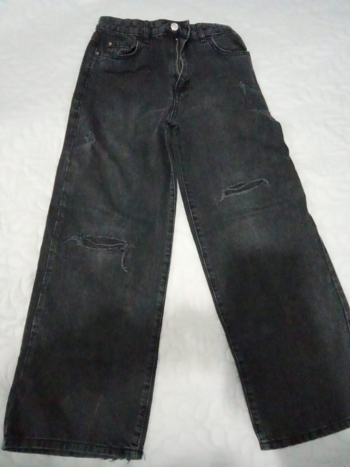 Siyah kot pantolon, geniş kesim ve midi boyda, yırtık detaylara sahip. Günlük kullanım için uygun, sokak stili rahatlığı sunar.