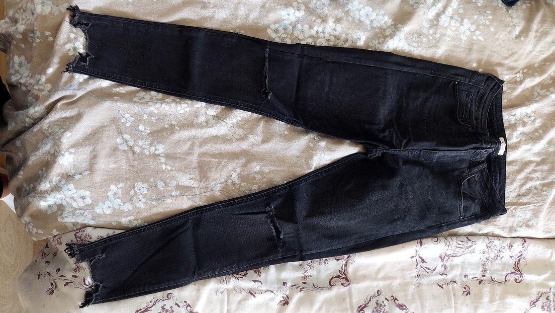 Fitted kesim siyah denim pantolon, yırtık detaylıdır. Trendy casual sokak stili için uygundur ve günlük kullanıma rahatlık sunar.