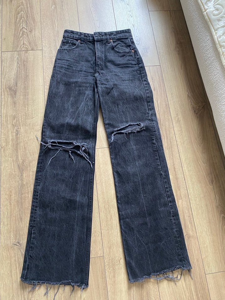 Siyah renkli, midi boy, bol kesim denim jean. Yırtık ve kesik detaylarıyla normcore tarzda, günlük sokak modasına uygun.