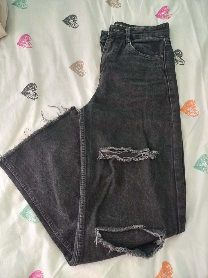 Siyah denim kumaştan, salaş kesim ve yırtık detaylara sahip kadın jean. Trendy ve rahat sokak stili için uygun.