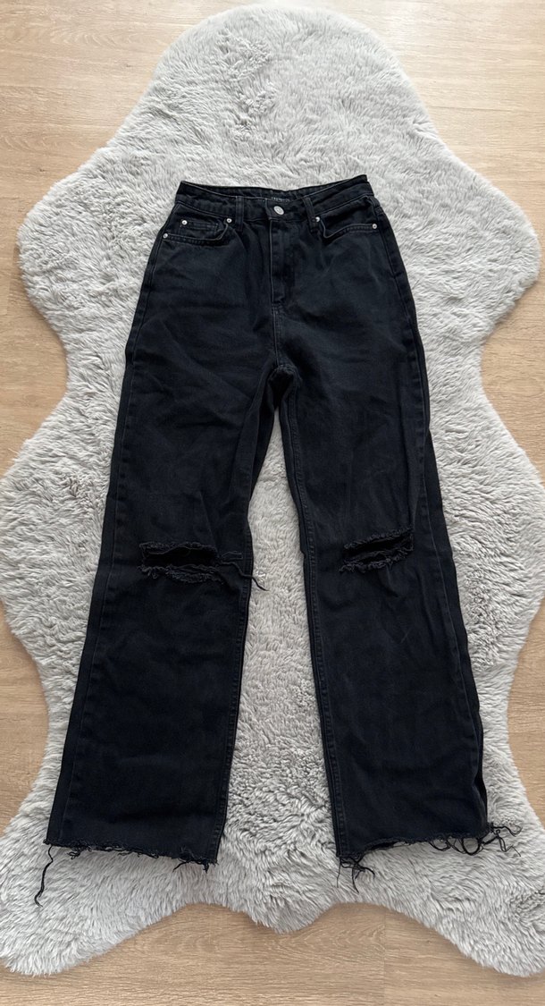 Siyah, yırtık detaylı, midi boyda salaş kot pantolon. Sokak stili ve rahat günlük kullanım için uygundur. ✨