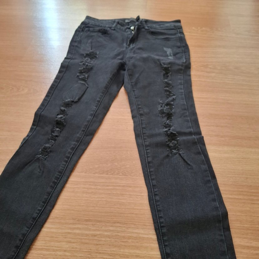 uzunluğu aşağıdan yukarı 93 cm bel genişliği 33.5 cm kusuru yok Siyah renkli, yırtık detaylı ve yırtmaçlı, normal midi boyda, dar kesim kadın jean. Günlük kullanıma uygun, grunge punk stilini yansıtır.