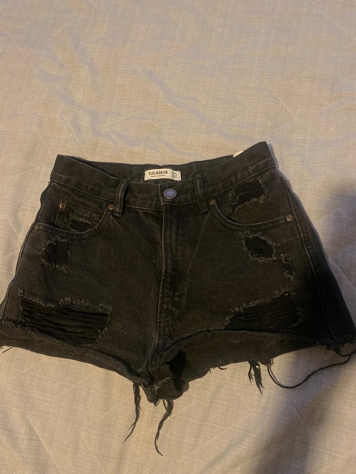 Siyah kot mini şort, bol kesim, yırtık detaylı .